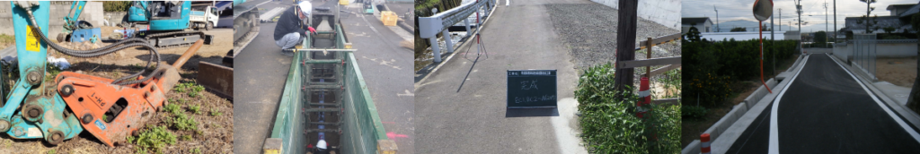 ・道路を切断し、掘削、下水道管を敷設し、埋め戻し、舗装工事を行います。